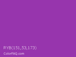 RYB 151,53,173 Color is a normal purple color and the nearest color is Purpureus #9a4eae. Hex code #9735ad and RGB value is rgb(151,53,173). In RGB color space, this color is composed of 59% red, 21% green, 68% blue, In CMYK color space, this color is composed of 13% cyan, 69% magenta, 0% yellow , 32% black , In HSL color space, this color has a hue angle of 289° , 53% saturation and 44% lightness.