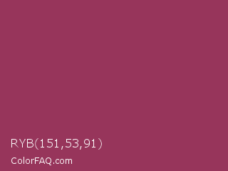 RYB 151,53,91 Color is a normal rose color and the nearest color is Vin Rouge #983d61. Hex code #97355b and RGB value is rgb(151,53,91). In RGB color space, this color is composed of 59% red, 21% green, 36% blue, In CMYK color space, this color is composed of 0% cyan, 65% magenta, 40% yellow , 41% black , In HSL color space, this color has a hue angle of 337° , 48% saturation and 40% lightness.