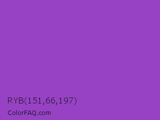 RYB 151,66,197 Color is a normal purple color and the nearest color is Dark Orchid #9932cc. Hex code #9742c5 and RGB value is rgb(151,66,197). In RGB color space, this color is composed of 59% red, 26% green, 77% blue, In CMYK color space, this color is composed of 23% cyan, 66% magenta, 0% yellow , 23% black , In HSL color space, this color has a hue angle of 279° , 53% saturation and 52% lightness.