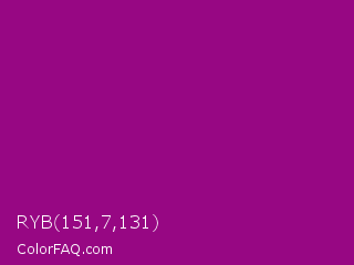 RYB 151,7,131 Color is a normal magenta color and the nearest color is Dark Magenta #8b008b. Hex code #970783 and RGB value is rgb(151,7,131). In RGB color space, this color is composed of 59% red, 3% green, 51% blue, In CMYK color space, this color is composed of 0% cyan, 95% magenta, 13% yellow , 41% black , In HSL color space, this color has a hue angle of 308° , 91% saturation and 31% lightness.