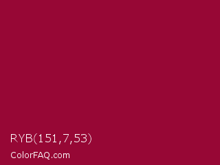RYB 151,7,53 Color is a normal rose color and the nearest color is Pink Raspberry #980036. Hex code #970735 and RGB value is rgb(151,7,53). In RGB color space, this color is composed of 59% red, 3% green, 21% blue, In CMYK color space, this color is composed of 0% cyan, 95% magenta, 65% yellow , 41% black , In HSL color space, this color has a hue angle of 341° , 91% saturation and 31% lightness.