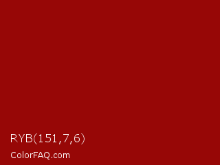 RYB 151,7,6 Color is a normal red color and the nearest color is Crimson Red #990000. Hex code #970706 and RGB value is rgb(151,7,6). In RGB color space, this color is composed of 59% red, 3% green, 2% blue, In CMYK color space, this color is composed of 0% cyan, 95% magenta, 96% yellow , 41% black , In HSL color space, this color has a hue angle of 0° , 92% saturation and 31% lightness.