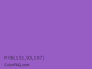 RYB 151,93,197 Color is a normal purple color and the nearest color is Amethyst #9966cc. Hex code #975dc5 and RGB value is rgb(151,93,197). In RGB color space, this color is composed of 59% red, 36% green, 77% blue, In CMYK color space, this color is composed of 23% cyan, 53% magenta, 0% yellow , 23% black , In HSL color space, this color has a hue angle of 273° , 47% saturation and 57% lightness.