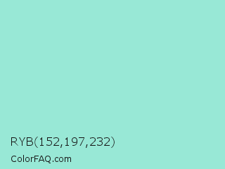 RYB 152,197,232 Color is a light cyan color and the nearest color is Pale Robin Egg Blue #96ded1. Hex code #98e8d6 and RGB value is rgb(152,232,214). In RGB color space, this color is composed of 60% red, 91% green, 84% blue, In CMYK color space, this color is composed of 34% cyan, 0% magenta, 8% yellow , 9% black , In HSL color space, this color has a hue angle of 167° , 63% saturation and 75% lightness.
