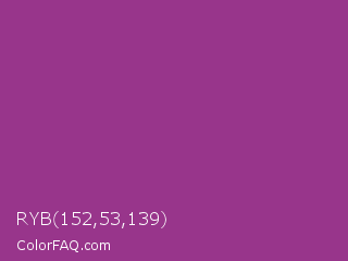RYB 152,53,139 Color is a normal magenta color and the nearest color is Plum #8e4585. Hex code #98358b and RGB value is rgb(152,53,139). In RGB color space, this color is composed of 60% red, 21% green, 55% blue, In CMYK color space, this color is composed of 0% cyan, 65% magenta, 9% yellow , 40% black , In HSL color space, this color has a hue angle of 308° , 48% saturation and 40% lightness.