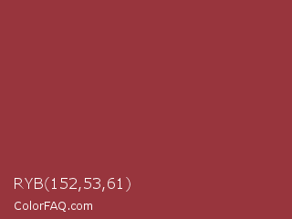 RYB 152,53,61 Color is a normal red color and the nearest color is Stiletto #9c3336. Hex code #98353d and RGB value is rgb(152,53,61). In RGB color space, this color is composed of 60% red, 21% green, 24% blue, In CMYK color space, this color is composed of 0% cyan, 65% magenta, 60% yellow , 40% black , In HSL color space, this color has a hue angle of 355° , 48% saturation and 40% lightness.