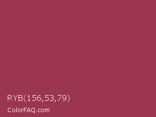 RYB 156,53,79 Color is a normal red color and the nearest color is Night Shadz #aa375a. Hex code #9c354f and RGB value is rgb(156,53,79). In RGB color space, this color is composed of 61% red, 21% green, 31% blue, In CMYK color space, this color is composed of 0% cyan, 66% magenta, 49% yellow , 39% black , In HSL color space, this color has a hue angle of 345° , 49% saturation and 41% lightness.