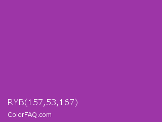 RYB 157,53,167 Color is a normal magenta color and the nearest color is Purpureus #9a4eae. Hex code #9d35a7 and RGB value is rgb(157,53,167). In RGB color space, this color is composed of 62% red, 21% green, 65% blue, In CMYK color space, this color is composed of 6% cyan, 68% magenta, 0% yellow , 35% black , In HSL color space, this color has a hue angle of 295° , 52% saturation and 43% lightness.