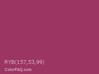 RYB 157,53,99 Color is a normal rose color and the nearest color is Vin Rouge #983d61. Hex code #9d3563 and RGB value is rgb(157,53,99). In RGB color space, this color is composed of 62% red, 21% green, 39% blue, In CMYK color space, this color is composed of 0% cyan, 66% magenta, 37% yellow , 38% black , In HSL color space, this color has a hue angle of 333° , 50% saturation and 41% lightness.