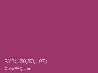 RYB 158,53,107 Color is a normal rose color and the nearest color is Rouge #a23b6c. Hex code #9e356b and RGB value is rgb(158,53,107). In RGB color space, this color is composed of 62% red, 21% green, 42% blue, In CMYK color space, this color is composed of 0% cyan, 66% magenta, 32% yellow , 38% black , In HSL color space, this color has a hue angle of 329° , 50% saturation and 41% lightness.