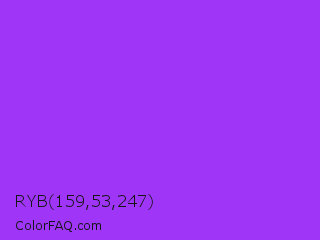 RYB 159,53,247 Color is a normal purple color and the nearest color is Veronica #a020f0. Hex code #9f35f7 and RGB value is rgb(159,53,247). In RGB color space, this color is composed of 62% red, 21% green, 97% blue, In CMYK color space, this color is composed of 36% cyan, 79% magenta, 0% yellow , 3% black , In HSL color space, this color has a hue angle of 273° , 92% saturation and 59% lightness.