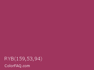 RYB 159,53,94 Color is a normal rose color and the nearest color is Vin Rouge #983d61. Hex code #9f355e and RGB value is rgb(159,53,94). In RGB color space, this color is composed of 62% red, 21% green, 37% blue, In CMYK color space, this color is composed of 0% cyan, 67% magenta, 41% yellow , 38% black , In HSL color space, this color has a hue angle of 337° , 50% saturation and 42% lightness.