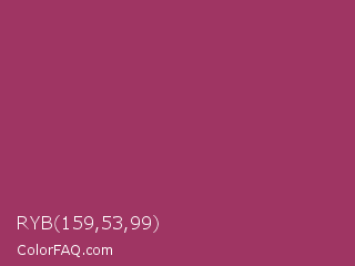 RYB 159,53,99 Color is a normal rose color and the nearest color is Vin Rouge #983d61. Hex code #9f3563 and RGB value is rgb(159,53,99). In RGB color space, this color is composed of 62% red, 21% green, 39% blue, In CMYK color space, this color is composed of 0% cyan, 67% magenta, 38% yellow , 38% black , In HSL color space, this color has a hue angle of 334° , 50% saturation and 42% lightness.