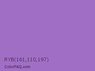 RYB 161,110,197 Color is a normal purple color and the nearest color is Rich Lavender #a76bcf. Hex code #a16ec5 and RGB value is rgb(161,110,197). In RGB color space, this color is composed of 63% red, 43% green, 77% blue, In CMYK color space, this color is composed of 18% cyan, 44% magenta, 0% yellow , 23% black , In HSL color space, this color has a hue angle of 275° , 43% saturation and 60% lightness.