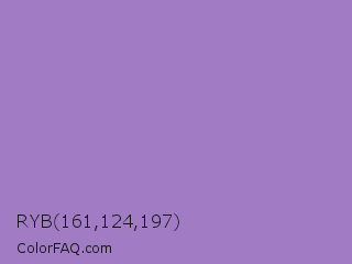 RYB 161,124,197 Color is a light violet color and the nearest color is Lilac Bush #9874d3. Hex code #a17cc5 and RGB value is rgb(161,124,197). In RGB color space, this color is composed of 63% red, 49% green, 77% blue, In CMYK color space, this color is composed of 18% cyan, 37% magenta, 0% yellow , 23% black , In HSL color space, this color has a hue angle of 270° , 39% saturation and 63% lightness.