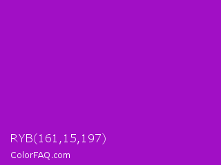 RYB 161,15,197 Color is a normal purple color and the nearest color is Purple Munsell #9f00c5. Hex code #a10fc5 and RGB value is rgb(161,15,197). In RGB color space, this color is composed of 63% red, 6% green, 77% blue, In CMYK color space, this color is composed of 18% cyan, 92% magenta, 0% yellow , 23% black , In HSL color space, this color has a hue angle of 288° , 86% saturation and 42% lightness.