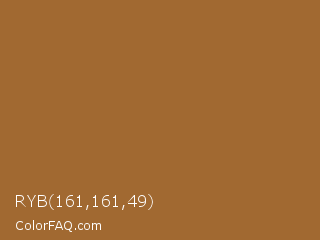 RYB 161,161,49 Color is a normal orange color and the nearest color is Cape Palliser #a26645. Hex code #a16931 and RGB value is rgb(161,105,49). In RGB color space, this color is composed of 63% red, 41% green, 19% blue, In CMYK color space, this color is composed of 0% cyan, 35% magenta, 70% yellow , 37% black , In HSL color space, this color has a hue angle of 30° , 53% saturation and 41% lightness.
