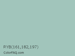 RYB 161,182,197 Color is a light green color and the nearest color is Shadow Green #9ac2b8. Hex code #a1c5bb and RGB value is rgb(161,197,187). In RGB color space, this color is composed of 63% red, 77% green, 73% blue, In CMYK color space, this color is composed of 18% cyan, 0% magenta, 5% yellow , 23% black , In HSL color space, this color has a hue angle of 163° , 24% saturation and 70% lightness.