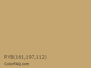 RYB 161,197,112 Color is a light orange color and the nearest color is Desert Camel #c19a6b. Hex code #c5a670 and RGB value is rgb(197,166,112). In RGB color space, this color is composed of 77% red, 65% green, 44% blue, In CMYK color space, this color is composed of 0% cyan, 16% magenta, 43% yellow , 23% black , In HSL color space, this color has a hue angle of 38° , 42% saturation and 61% lightness.