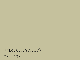 RYB 161,197,157 Color is a light yellow color and the nearest color is Coral Reef #c7bca2. Hex code #c5c19d and RGB value is rgb(197,193,157). In RGB color space, this color is composed of 77% red, 76% green, 62% blue, In CMYK color space, this color is composed of 0% cyan, 2% magenta, 20% yellow , 23% black , In HSL color space, this color has a hue angle of 54° , 26% saturation and 69% lightness.