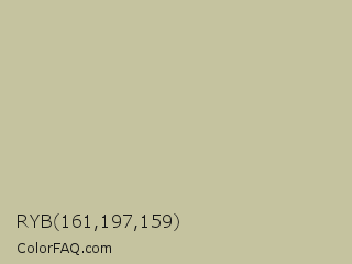 RYB 161,197,159 Color is a light yellow color and the nearest color is Coral Reef #c7bca2. Hex code #c5c39f and RGB value is rgb(197,195,159). In RGB color space, this color is composed of 77% red, 76% green, 62% blue, In CMYK color space, this color is composed of 0% cyan, 1% magenta, 19% yellow , 23% black , In HSL color space, this color has a hue angle of 57° , 25% saturation and 70% lightness.