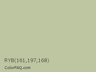 RYB 161,197,168 Color is a light lime color and the nearest color is Rainee #b9c8ac. Hex code #bec5a1 and RGB value is rgb(190,197,161). In RGB color space, this color is composed of 75% red, 77% green, 63% blue, In CMYK color space, this color is composed of 4% cyan, 0% magenta, 18% yellow , 23% black , In HSL color space, this color has a hue angle of 72° , 24% saturation and 70% lightness.