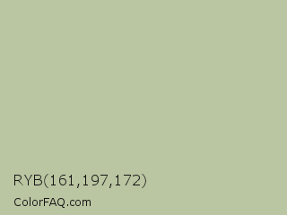 RYB 161,197,172 Color is a light lime color and the nearest color is Rainee #b9c8ac. Hex code #bac5a1 and RGB value is rgb(186,197,161). In RGB color space, this color is composed of 73% red, 77% green, 63% blue, In CMYK color space, this color is composed of 6% cyan, 0% magenta, 18% yellow , 23% black , In HSL color space, this color has a hue angle of 78° , 24% saturation and 70% lightness.