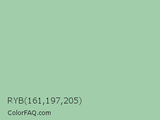 RYB 161,197,205 Color is a light green color and the nearest color is Cambridge Blue #a3c1ad. Hex code #a1cdab and RGB value is rgb(161,205,171). In RGB color space, this color is composed of 63% red, 80% green, 67% blue, In CMYK color space, this color is composed of 21% cyan, 0% magenta, 17% yellow , 20% black , In HSL color space, this color has a hue angle of 134° , 31% saturation and 72% lightness.