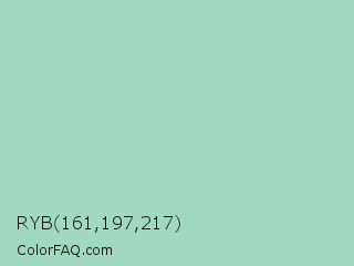 RYB 161,197,217 Color is a light green color and the nearest color is Sea Foam Green #9fe2bf. Hex code #a1d9c0 and RGB value is rgb(161,217,192). In RGB color space, this color is composed of 63% red, 85% green, 75% blue, In CMYK color space, this color is composed of 26% cyan, 0% magenta, 12% yellow , 15% black , In HSL color space, this color has a hue angle of 153° , 42% saturation and 74% lightness.