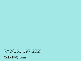 RYB 161,197,232 Color is a light cyan color and the nearest color is Water Leaf #a1e9de. Hex code #a1e8e6 and RGB value is rgb(161,232,230). In RGB color space, this color is composed of 63% red, 91% green, 90% blue, In CMYK color space, this color is composed of 31% cyan, 0% magenta, 1% yellow , 9% black , In HSL color space, this color has a hue angle of 178° , 61% saturation and 77% lightness.