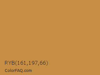 RYB 161,197,66 Color is a normal orange color and the nearest color is Peru #cd853f. Hex code #c58e42 and RGB value is rgb(197,142,66). In RGB color space, this color is composed of 77% red, 56% green, 26% blue, In CMYK color space, this color is composed of 0% cyan, 28% magenta, 66% yellow , 23% black , In HSL color space, this color has a hue angle of 35° , 53% saturation and 52% lightness.