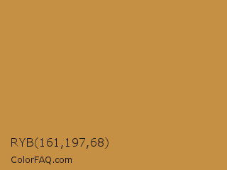 RYB 161,197,68 Color is a normal orange color and the nearest color is Tussock #c5994b. Hex code #c58f44 and RGB value is rgb(197,143,68). In RGB color space, this color is composed of 77% red, 56% green, 27% blue, In CMYK color space, this color is composed of 0% cyan, 27% magenta, 65% yellow , 23% black , In HSL color space, this color has a hue angle of 35° , 53% saturation and 52% lightness.
