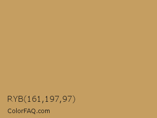 RYB 161,197,97 Color is a normal orange color and the nearest color is Brown Yellow #cc9966. Hex code #c59e61 and RGB value is rgb(197,158,97). In RGB color space, this color is composed of 77% red, 62% green, 38% blue, In CMYK color space, this color is composed of 0% cyan, 20% magenta, 51% yellow , 23% black , In HSL color space, this color has a hue angle of 37° , 46% saturation and 58% lightness.
