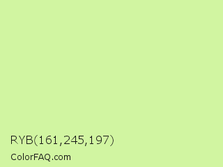 RYB 161,245,197 Color is a light green color and the nearest color is Reef #c9ffa2. Hex code #d1f5a1 and RGB value is rgb(209,245,161). In RGB color space, this color is composed of 82% red, 96% green, 63% blue, In CMYK color space, this color is composed of 15% cyan, 0% magenta, 34% yellow , 4% black , In HSL color space, this color has a hue angle of 86° , 81% saturation and 80% lightness.
