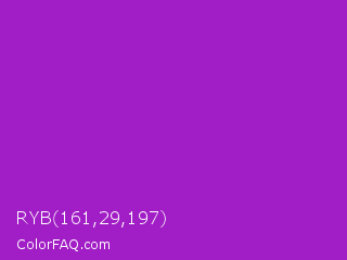 RYB 161,29,197 Color is a normal purple color and the nearest color is Dark Orchid #9932cc. Hex code #a11dc5 and RGB value is rgb(161,29,197). In RGB color space, this color is composed of 63% red, 11% green, 77% blue, In CMYK color space, this color is composed of 18% cyan, 85% magenta, 0% yellow , 23% black , In HSL color space, this color has a hue angle of 287° , 74% saturation and 44% lightness.