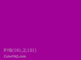 RYB 161,2,151 Color is a normal magenta color and the nearest color is Violet Eggplant #991199. Hex code #a10297 and RGB value is rgb(161,2,151). In RGB color space, this color is composed of 63% red, 1% green, 59% blue, In CMYK color space, this color is composed of 0% cyan, 99% magenta, 6% yellow , 37% black , In HSL color space, this color has a hue angle of 304° , 98% saturation and 32% lightness.