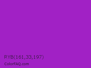 RYB 161,33,197 Color is a normal purple color and the nearest color is Dark Orchid #9932cc. Hex code #a121c5 and RGB value is rgb(161,33,197). In RGB color space, this color is composed of 63% red, 13% green, 77% blue, In CMYK color space, this color is composed of 18% cyan, 83% magenta, 0% yellow , 23% black , In HSL color space, this color has a hue angle of 287° , 71% saturation and 45% lightness.