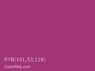 RYB 161,53,118 Color is a normal magenta color and the nearest color is Maximum Red Purple #a63a79. Hex code #a13576 and RGB value is rgb(161,53,118). In RGB color space, this color is composed of 63% red, 21% green, 46% blue, In CMYK color space, this color is composed of 0% cyan, 67% magenta, 27% yellow , 37% black , In HSL color space, this color has a hue angle of 324° , 50% saturation and 42% lightness.