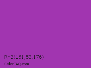 RYB 161,53,176 Color is a normal magenta color and the nearest color is Purpureus #9a4eae. Hex code #a135b0 and RGB value is rgb(161,53,176). In RGB color space, this color is composed of 63% red, 21% green, 69% blue, In CMYK color space, this color is composed of 9% cyan, 70% magenta, 0% yellow , 31% black , In HSL color space, this color has a hue angle of 293° , 54% saturation and 45% lightness.