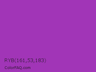 RYB 161,53,183 Color is a normal purple color and the nearest color is Dark Orchid #9932cc. Hex code #a135b7 and RGB value is rgb(161,53,183). In RGB color space, this color is composed of 63% red, 21% green, 72% blue, In CMYK color space, this color is composed of 12% cyan, 71% magenta, 0% yellow , 28% black , In HSL color space, this color has a hue angle of 290° , 55% saturation and 46% lightness.