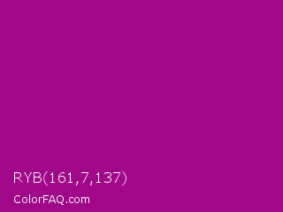 RYB 161,7,137 Color is a normal magenta color and the nearest color is Violet Eggplant #991199. Hex code #a10789 and RGB value is rgb(161,7,137). In RGB color space, this color is composed of 63% red, 3% green, 54% blue, In CMYK color space, this color is composed of 0% cyan, 96% magenta, 15% yellow , 37% black , In HSL color space, this color has a hue angle of 309° , 92% saturation and 33% lightness.