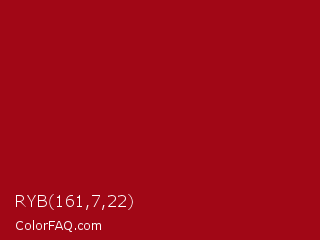 RYB 161,7,22 Color is a normal red color and the nearest color is Spartan Crimson #9e1316. Hex code #a10716 and RGB value is rgb(161,7,22). In RGB color space, this color is composed of 63% red, 3% green, 9% blue, In CMYK color space, this color is composed of 0% cyan, 96% magenta, 86% yellow , 37% black , In HSL color space, this color has a hue angle of 354° , 92% saturation and 33% lightness.
