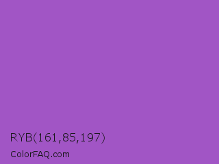 RYB 161,85,197 Color is a normal purple color and the nearest color is Deep Lilac #9955bb. Hex code #a155c5 and RGB value is rgb(161,85,197). In RGB color space, this color is composed of 63% red, 33% green, 77% blue, In CMYK color space, this color is composed of 18% cyan, 57% magenta, 0% yellow , 23% black , In HSL color space, this color has a hue angle of 281° , 49% saturation and 55% lightness.