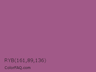 RYB 161,89,136 Color is a normal magenta color and the nearest color is Strikemaster #956387. Hex code #a15988 and RGB value is rgb(161,89,136). In RGB color space, this color is composed of 63% red, 35% green, 53% blue, In CMYK color space, this color is composed of 0% cyan, 45% magenta, 16% yellow , 37% black , In HSL color space, this color has a hue angle of 321° , 29% saturation and 49% lightness.