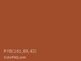 RYB 161,89,43 Color is a normal orange color and the nearest color is Paarl #a65529. Hex code #a14c2b and RGB value is rgb(161,76,43). In RGB color space, this color is composed of 63% red, 30% green, 17% blue, In CMYK color space, this color is composed of 0% cyan, 53% magenta, 73% yellow , 37% black , In HSL color space, this color has a hue angle of 17° , 58% saturation and 40% lightness.