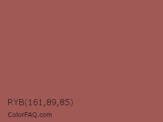 RYB 161,89,85 Color is a normal red color and the nearest color is Redwood #a45a52. Hex code #a15955 and RGB value is rgb(161,89,85). In RGB color space, this color is composed of 63% red, 35% green, 33% blue, In CMYK color space, this color is composed of 0% cyan, 45% magenta, 47% yellow , 37% black , In HSL color space, this color has a hue angle of 3° , 31% saturation and 48% lightness.
