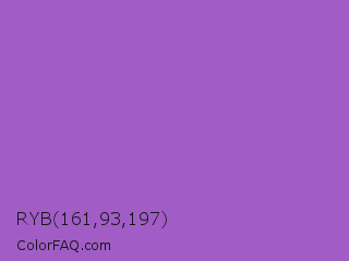 RYB 161,93,197 Color is a normal purple color and the nearest color is Amethyst #9966cc. Hex code #a15dc5 and RGB value is rgb(161,93,197). In RGB color space, this color is composed of 63% red, 36% green, 77% blue, In CMYK color space, this color is composed of 18% cyan, 53% magenta, 0% yellow , 23% black , In HSL color space, this color has a hue angle of 279° , 47% saturation and 57% lightness.