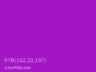 RYB 162,22,197 Color is a normal purple color and the nearest color is Purple Munsell #9f00c5. Hex code #a216c5 and RGB value is rgb(162,22,197). In RGB color space, this color is composed of 64% red, 9% green, 77% blue, In CMYK color space, this color is composed of 18% cyan, 89% magenta, 0% yellow , 23% black , In HSL color space, this color has a hue angle of 288° , 80% saturation and 43% lightness.