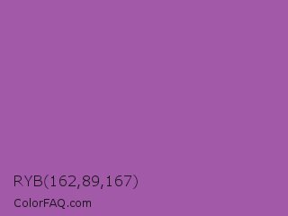 RYB 162,89,167 Color is a normal magenta color and the nearest color is Purpureus #9a4eae. Hex code #a259a7 and RGB value is rgb(162,89,167). In RGB color space, this color is composed of 64% red, 35% green, 65% blue, In CMYK color space, this color is composed of 3% cyan, 47% magenta, 0% yellow , 35% black , In HSL color space, this color has a hue angle of 296° , 31% saturation and 50% lightness.