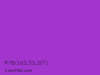 RYB 163,53,207 Color is a normal purple color and the nearest color is Dark Orchid #9932cc. Hex code #a335cf and RGB value is rgb(163,53,207). In RGB color space, this color is composed of 64% red, 21% green, 81% blue, In CMYK color space, this color is composed of 21% cyan, 74% magenta, 0% yellow , 19% black , In HSL color space, this color has a hue angle of 283° , 62% saturation and 51% lightness.